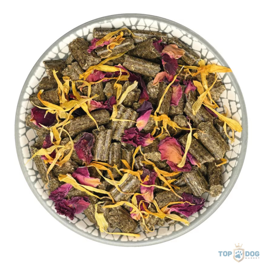 Állandó rétek terményei (timothy, réti csenkesz, vörös csenkesz, réti rókafarkkóró, kék fű, csomós ebír, turbolya, gyermekláncfű, réti csirkefű, cickafark, palástfű, borjúpázsit, lóhere, lándzsás útifű, réti zsálya, háromlevelű lóhere, magas csenkesz, réti harangvirág, kömény, búzavirág, közönséges borzhínár, angol aszat, puha rozsnok, közönséges pitypang, erdei sédbúza, bakszakáll, mezei borzhínár, erdei szamóca, kaszanyűg-bükköny, ösztörűs veronika, réti zörgőfű, tejoltó galaj, molyhos réti zab, mezei zsúrló, mezei zsúrló, felálló galaj, piros gólyaorr, margaréta, mezei varfű, réti foglár, réti füzény, perzsa veronika, franciaperje, réti rozs, útilapu, nagy búzavirág, abrakborsó, nefelejcs, gurgolya, földitömjén, indás pimpó, tavaszi kankalin, bókoló habszegfű, kis réti fű, pázsitos csillaghúr, réti bakszakáll, csalán, illatos veronika, vörös here, gyepűbükköny, genfi podagrafű, podagrafű, margaréta) zabhéj korpa, napraforgómag kivonat, lenmag kivonat, almatörköly, répatörköly, búzakorpa, repcemag kivonat, körömvirág (1,5%), rózsaszirom (1,5%), édeskömény mag, szárított papaya (0,25%), kamillavirág