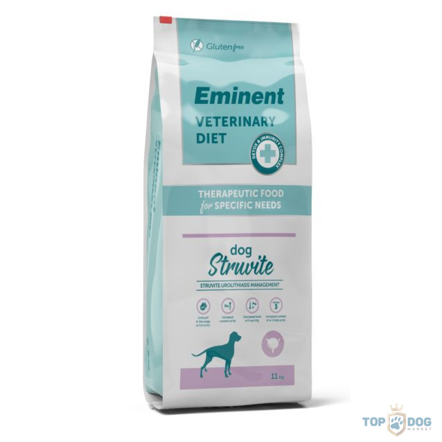 A struvit urolithiasisban (struvit kő) szenvedő betegek kezelésének nagyon fontos része a megfelelő táplálék kiválasztása, hogy a vizelet pH-ját olyan szinten tartsák, amelyben a struvit kristályok feloldódnak. Ezenkívül a kutyatápnak a struvit alkotóelemek csökkentett szintjét kell tartalmaznia, hogy megakadályozza azok újraképződését. Ezeknek a különleges követelményeknek felel meg a teljesértékű Eminent Diet Dog Struvite kutyatáp. Másik funkcionális alkotóeleme az áfonya, amely proanthocianidineket tartalmaz, amely a baktériumok felületéhez kötődik, és így megakadályozza azok húgycső falához való kötődését. Ezáltal elősegítik az egész kiválasztó rendszer bakteriális fertőzéseinek megelőzését.