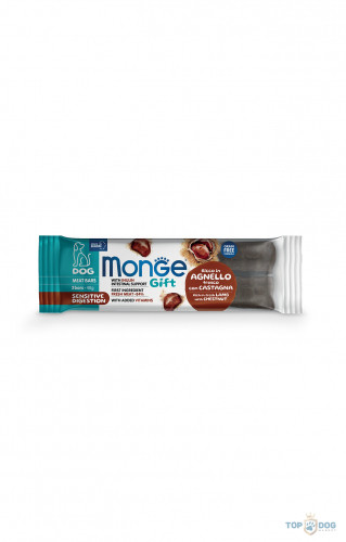 A MONGE GIFT ÉRZÉKENY EMÉSZTÉSŰ KUTYÁKNAK FRISS BÁRÁNYHÚSBAN GAZDAG GESZTENYÉVEL ÉS INULINNAL egy kiegészítő eledel felnőtt kutyák számára. Kifejezetten a kutya jóléte érdekében fejlesztették ki, inulint tartalmaz a bélrendszer egészségének támogatására, valamint vitaminokat a napi vitalitásért. Gabonafélék nélkül készült, friss hússal, amely értékes, könnyen emészthető fehérjeforrás, magas biológiai értékkel. A funkcionális összetevők, mint például az összehúzó tulajdonságokkal rendelkező gesztenye, a Made in Italy kutatásának eredménye, amelynek célja kutyáink életminőségének támogatása. Mesterséges színezékektől és hozzáadott cukroktól mentes. Friss hús 89% (bárány 14%), hidrolizált állati fehérjék (csirke és sertés), ásványi anyagok, inulin (1%), gesztenyepor (0,1%). Nyersfehérje: 34%, Nyersrost: 1%, Nyerszsír: 28%, Nyershamu: 7%, Nedvességtartalom: 27%, Metabolizálható energia 3675 kcal/kg.