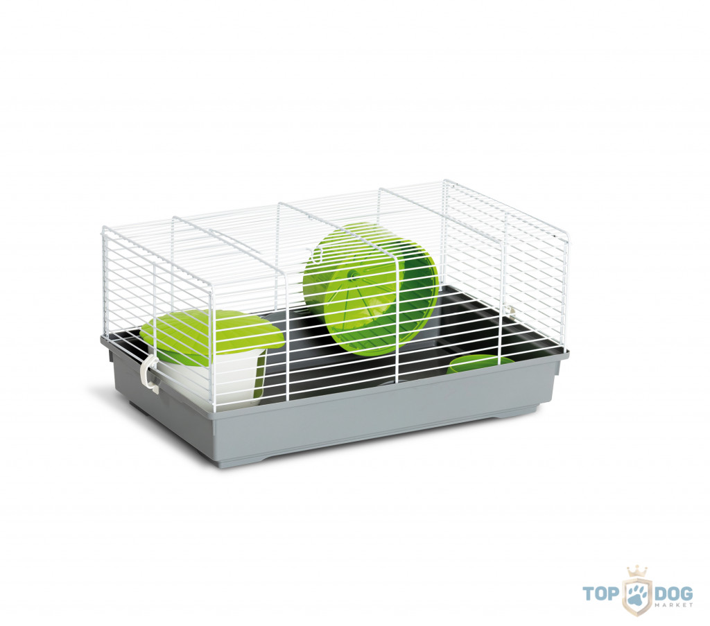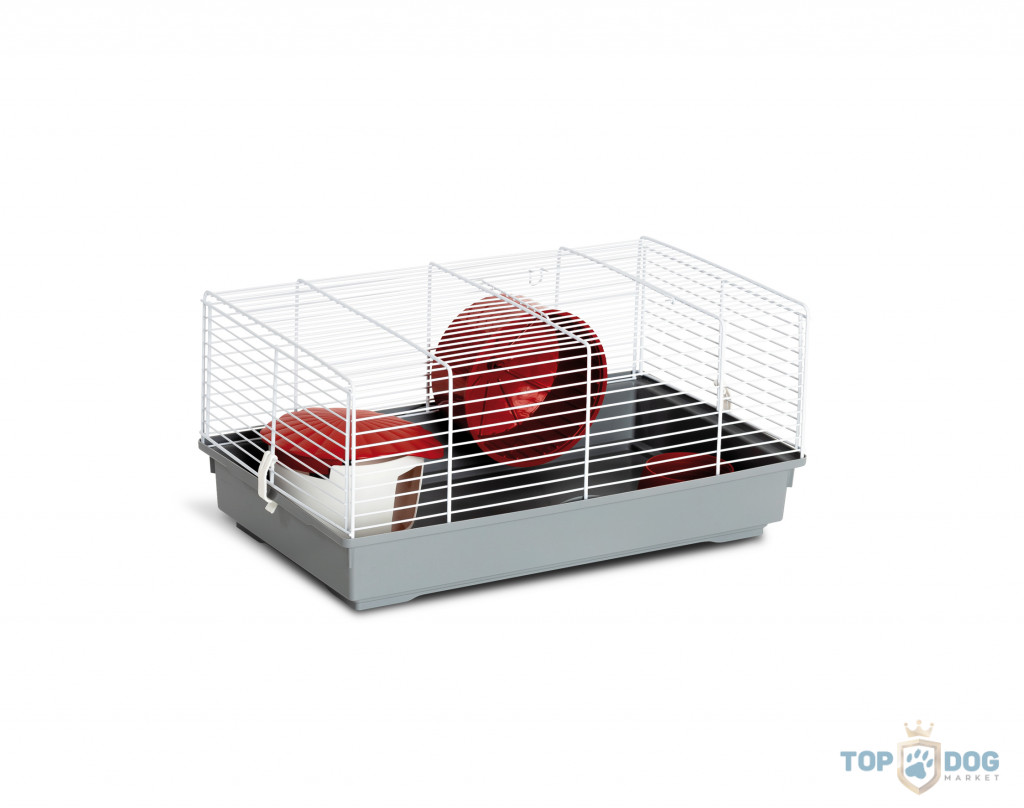 Tökéletes választás ez a felszerelt hörcsögketrec kis kedvence számára. Melyben etetőtál, forgó és kisház is van.